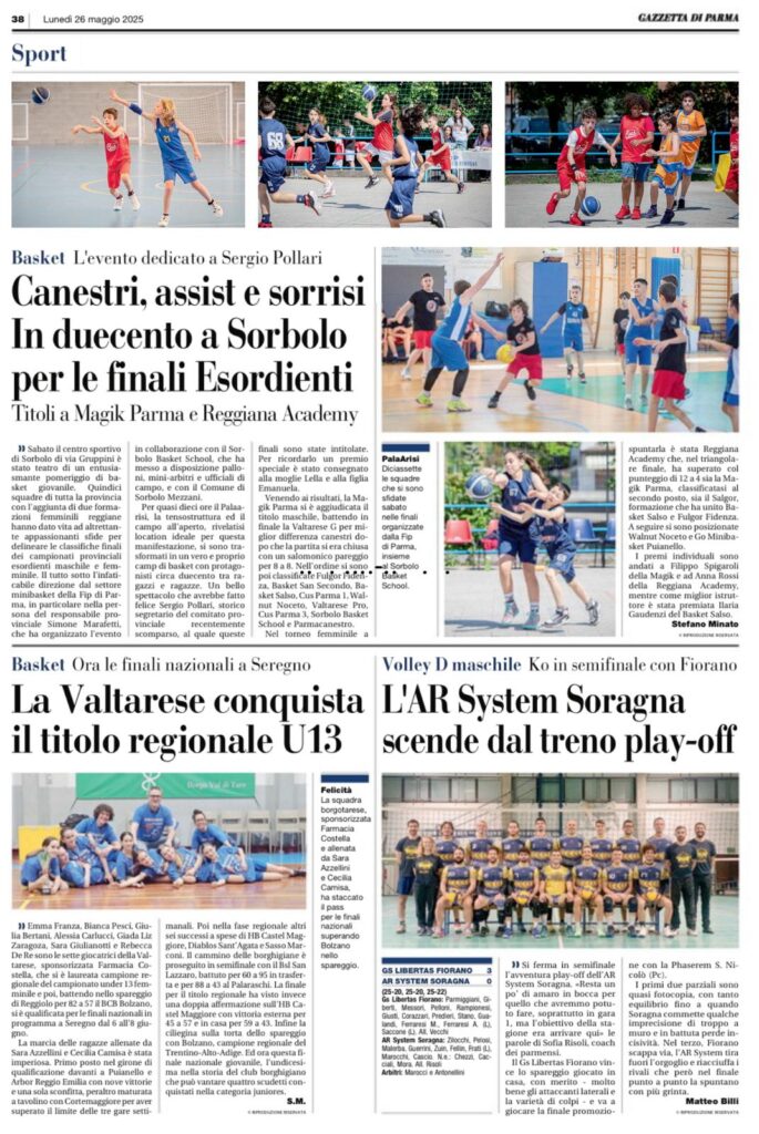 Sabato 24 maggio, al Centro Sportivo di Sorbolo, in duecento per le finali Esordienti: canestri, assist e sorrisi. Evento dedicato a Sergio Pollari _storico Segretario del Comitato Provinciale_. Organizzato dal Settore Minibasket FIP Parma _nella persona del Responsabile Provinciale Minibasket Simone Marafetti_ in collaborazione con il Sorbolo Basket School e il Comune di Sorbolo Mezzani. Quindici squadre di tutta la Provincia con l’aggiunta di due formazioni femminili reggiane.