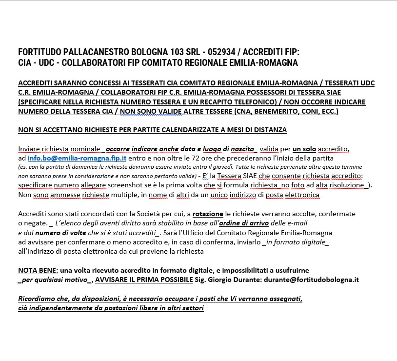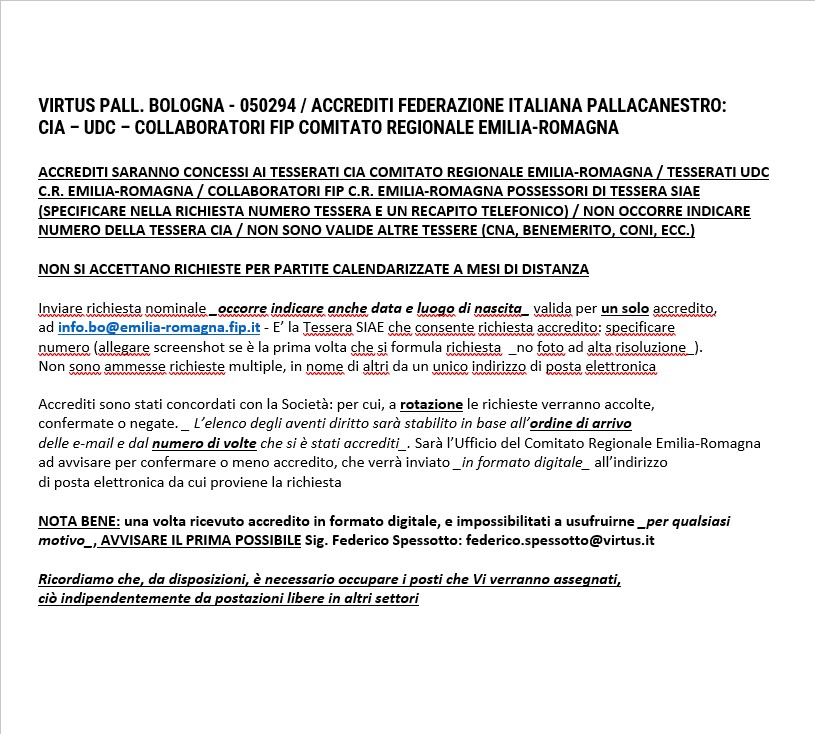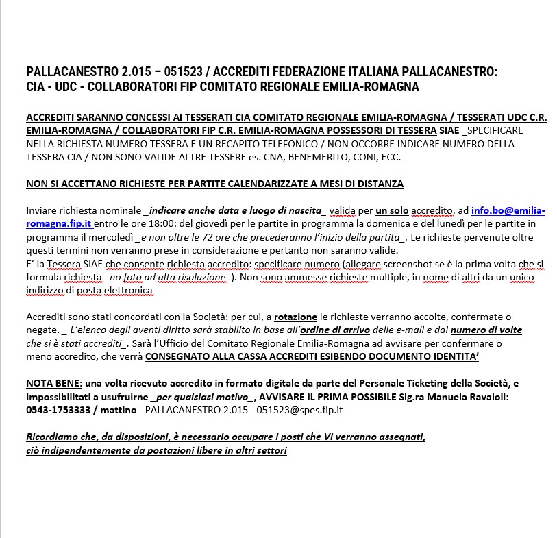 ✅ Il Comitato Regionale Emilia-Romagna è garante presso le Società Virtus Olidata Bologna, Pallacanestro Reggiana, Flats Service Fortitudo Bologna e Pallacanestro 2.015 Forlì dell’identità delle persone richiedenti accrediti. Si ribadisce pertanto che il titolo NON è cedibile. Il Comitato Regionale Emilia-Romagna si riserva la facoltà di eseguire controlli e in caso di comportamenti non ammessi di procedere con deferimento presso gli organi competenti