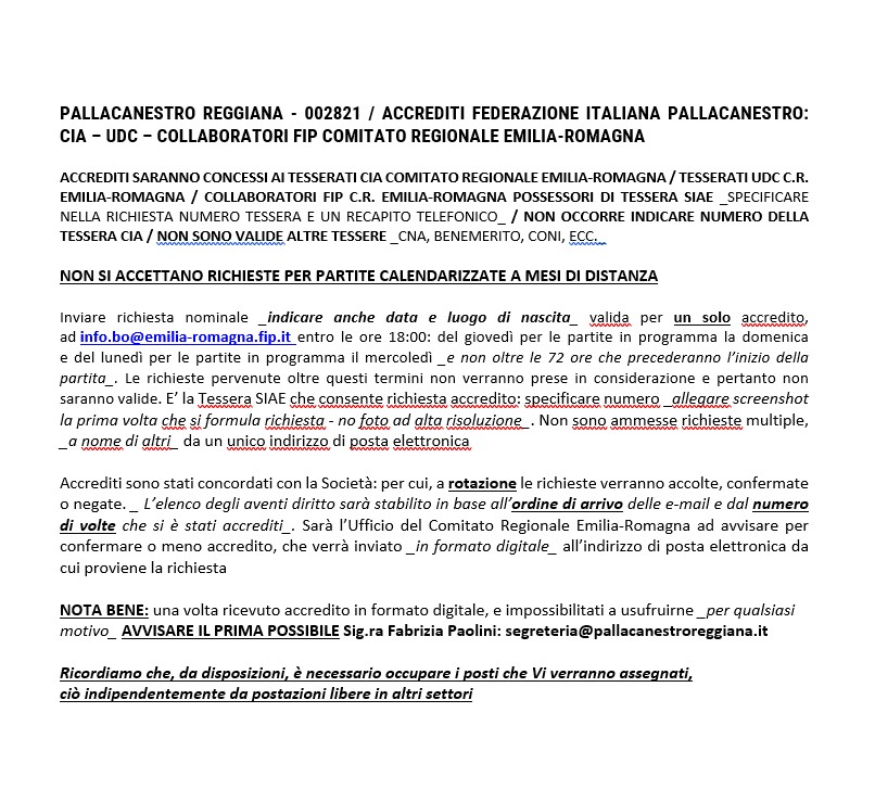 ✅ ACCREDITI SARANNO CONCESSI AI TESSERATI CIA COMITATO REGIONALE EMILIA-ROMAGNA / TESSERATI UDC C.R. EMILIA-ROMAGNA / COLLABORATORI FIP C.R. EMILIA-ROMAGNA CUI E’ STATA RILASCIATA TESSERA SIAE (SPECIFICARE NELLA RICHIESTA NUMERO TESSERA E UN RECAPITO TELEFONICO) / NON OCCORRE INDICARE NUMERO DELLA TESSERA CIA / NON SONO VALIDE ALTRE TESSERE (CNA, BENEMERITO, CONI, ECC.)